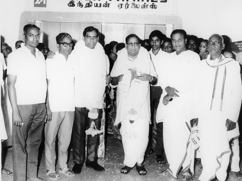 Send off by his brother Sadasivudu,and actor Gummadi and his maternal uncle Pichi Ramaiah(extreme right) to Ghantasala on his trip to USA at Madras airport in 1970 Mimicry artist Venumadhav next to Sadasivudu.